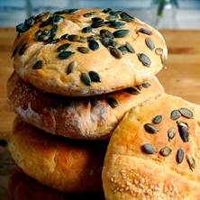 2. Sätt på ugnen på 225 grader. Ta upp degen och dela den i sex bitar. Forma till runda brödkakor och lägg dem två och två på plåtar. Skåra ett kryss i mitten av kakorna, pensla med yoghurt och lägg på pumpafrön. Jäs i 30 minuter under bakduk. Grädda i ugnen på 225 grader i 15 minuter.