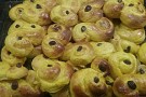 smält smöret i en kastrull. tillsätt mjölken och värm till fingervarmt. smula jästen i en bunke och häll degspadet över. rör om tills det löst sig. tillsätt Kesella, saffran, socker, salt och det mesta av mjölet. arbeta degen tills den blir blank och smidig. tillsätt ev mera mjöl. låt jäsa övertäckt ca 30 min. Arbeta degen på mjölat bakbord och forma till kusar. Lägg dem på smorda plåtar/bakplåtspapper. garnera med russin. Låt jäsa 20-30 min. Pensla med uppvispat ägg. Grädda i mitten av ugnen 225 grader, 5-7 min. Låt svalna på galler.