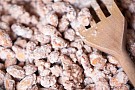 När sockret antagit sockerkonsistens igen – fortsätt att röra på låg värme, fast det tar emot och kräver lite armstyrka, tills det börjar smälta lite och bli blankt runt mandlarna.