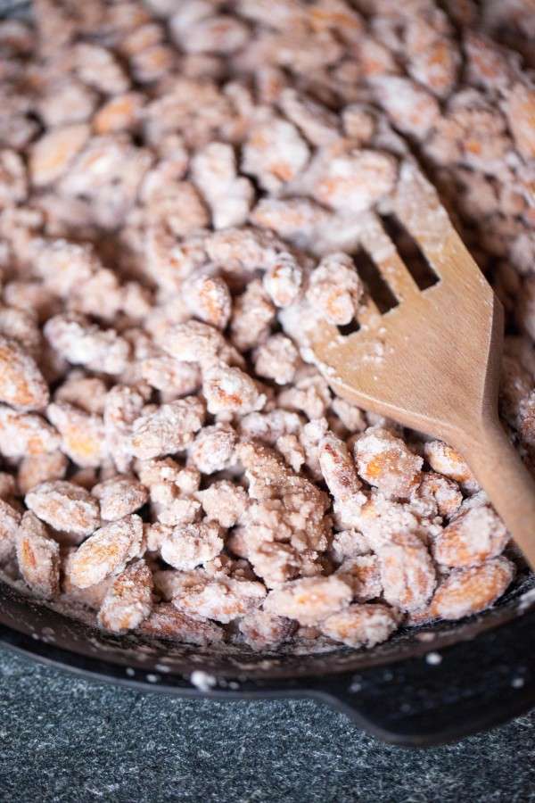 Rör ordentligt på låg värme medan sockret kristalliserar sig runt mandlarna.