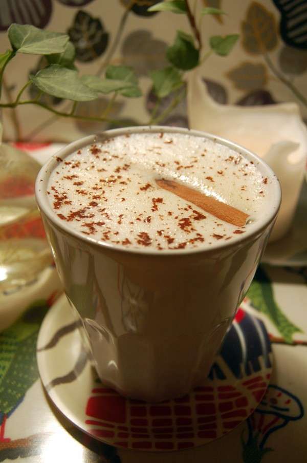 Häll upp i en mugg med kanelstång och riv lite mörk choklad över.