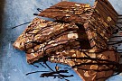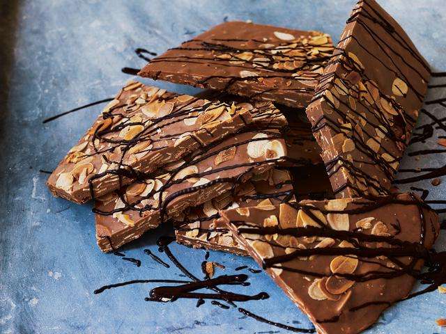Häll ut nougaten på en plåt med bakplåtspapper och strö över resten av mandelspånen.