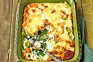 4. Fördela laxen, skuren i små bitar, och grönsaksblandningen i formen.