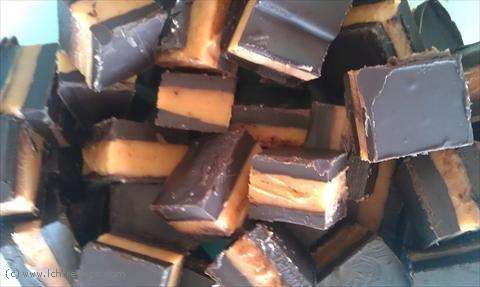 Häll ut chokladen, bred ut till ett lager och ställ in i frysen så det stelnar. Koka upp 100 g smör och 350 g jordnötssmör.