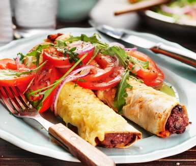 Fräs köttfärsen i olja. Skala och hacka lök och låt den fräsa med några minuter. Tillsätt tomatpuré och salsasås. Låt koka ihop något. Värm tortillabröden enligt förpackningens anvisning. Fördela köttfärsröran i bröden. Rulla ihop och lägg i en lätt smord ugnssäker form. Strö över riven ost. Gratinera i 225°C, ca 5 minuter. Servera med tomat- och löksallad.