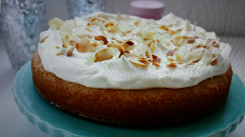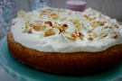 Bred ut grädden över den avsvalnade kakan. Strö över mandelspånen och