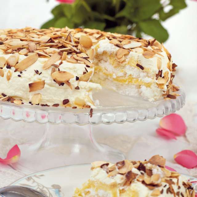 Bred ut krämen och lite vispgrädde på ena botten, lägg den andra ovanpå. Bred resten av grädden över och runt kanterna.