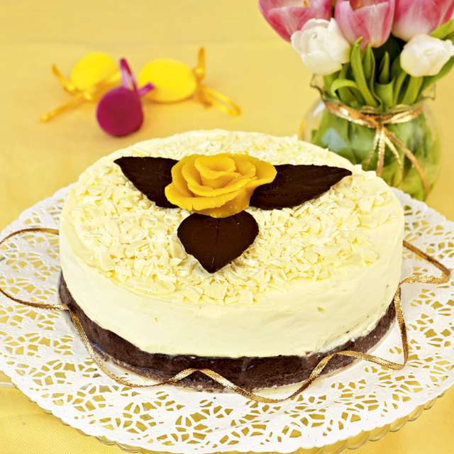 Riv vit choklad grovt med en osthyvel och strö över tårtan.