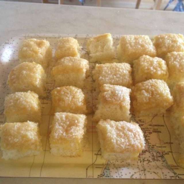 Bred ut krämen över kakan och strö sist på kokos.
