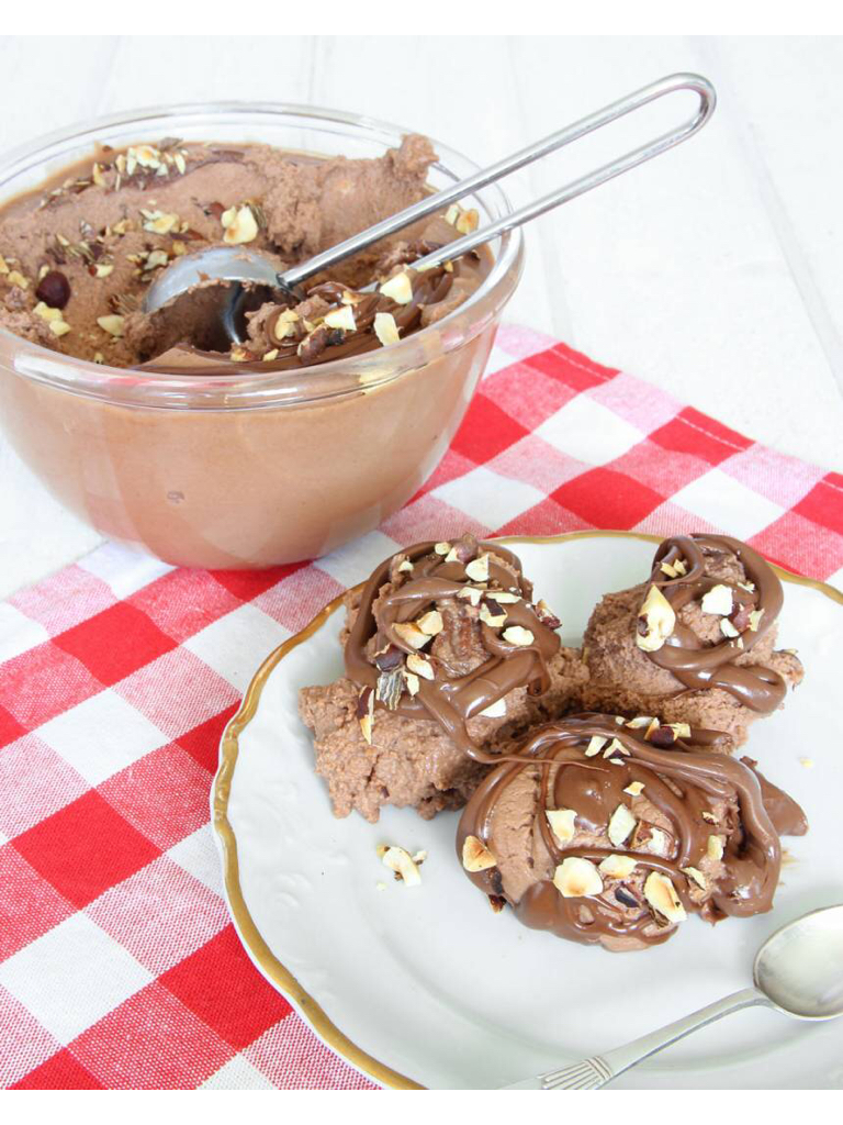 3. Häll glasskrämen i en form eller skål, ca 1 1/2 liter. Ställ den i frysen i 4–6 timmar eller tills den är genomfryst. Ringla eventuellt lite Nutella och strö rostade hasselnötter över glassen före servering (kan uteslutas).