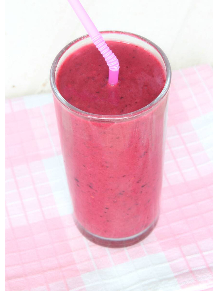 2. Mixa alla bären. Tillsätt mjölken, lite i taget tills smoothien är lagom i konsistensen. Drick den med sugrör eller ät med sked direkt när den är klar.