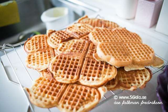 Mixa allt med stavmixer och grädda i smör i våffeljärn.