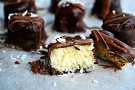 Gör små kuber av kokosmassan och doppa i smält choklad.