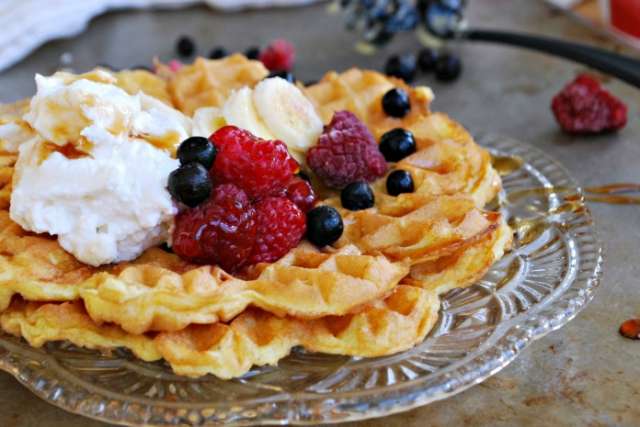 Smörj ett våffeljärn med matfett och grädda våfflor utav smeten.