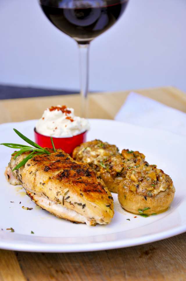 Kycklingfilé med ädelostfyllda champinjoner och blue cheese-kräm med sting