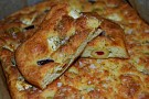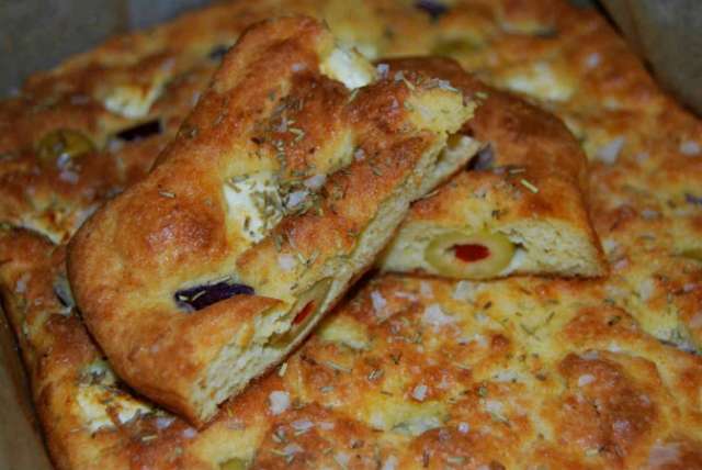 Peta ner oliver, tärnad fetaost, och grovt hackad rödlök i smeten.