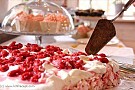 Bred över den rosa toppingen väl och dekorera med valfria bär.