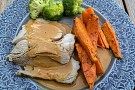Skär upp köttet och servera med den goda gräddsåsen, kokt broccoli och ugnsrostad sötpotatis. Supergottit!