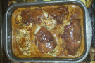 vispa ihop grädde, vinäger, fond och vitlök. Häll det i formen. Stek i mitten av ugnen i ca 15 min.