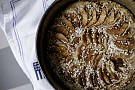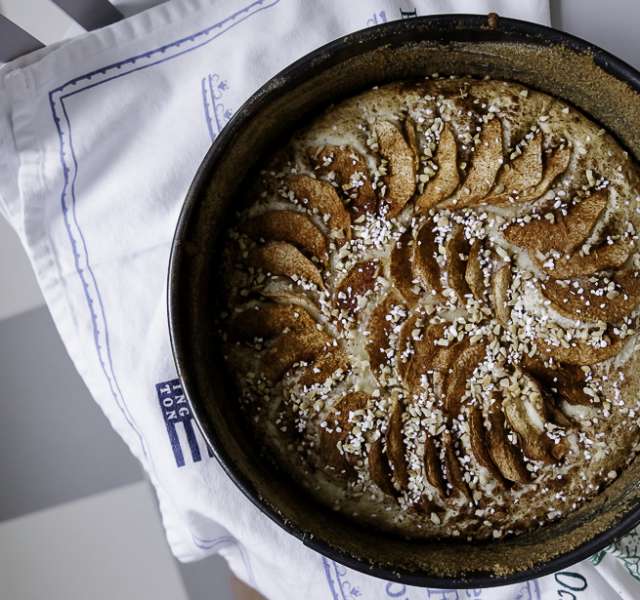 Grovriv mandelmassa och blanda ner i smeten. Bröa formen, häll i smet, skala och skiva äpplen och tryck i smet. Ös på med kanel, hackade hasselnötter och pärlsocker.