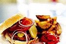 8.Servera med exempelvis hamburgerbröd, tomatskivor, smörgåsgurka, senap och ketchup. Och eventuellt majonnäs eller tomatsalsa. Samt gärna också ugnsbakade potatisklyftor.