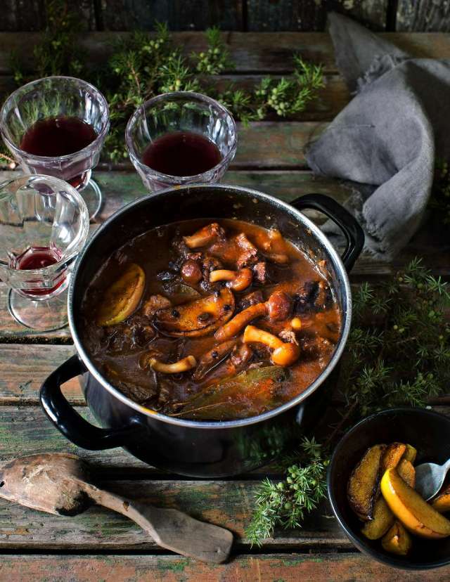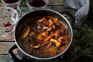 Häll i vin och stark köttbuljong så det täcker köttet och låt sjuda under lock i cirka 1 timme tills köttet är mört.