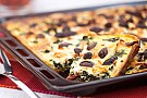 Sätt ugnen på 225° C Pajdeg: Hacka samman mjöl och matfett. Tillsätt vattnet och arbeta snabbt ihop till en deg. Linda in den i plastfolie och låt den ligga i kylskåp ca 30 minuter. Fyllning: Tina spenaten och krama ur vätskan. Skala och hacka vitlöken. Strimla tomaterna. Skär eller smula osten i mindre bitar. Låt oliverna rinna av. Äggstanning: Vispa ihop ägg, mjölk och kryddor. Kavla eller tryck ut degen i en långpanna 30x40 cm (för 8 port). Nagga degen med en gaffel. Låt den stå kallt ca 30 min. Förgrädda mitt i ugnen ca 10 min. Fördela spenat, vitlök, tomater, ost och oliver på pajbotten. Häll över äggstanningen. Grädda mitt i ugnen ca 30 min. Servera med tomater eller en sallad.