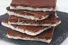 Ställ den i kylen för att stelna. Skär kakan i rutor (låt den stå framme en stund i rumstemperatur innan så chokladen inte spricker).