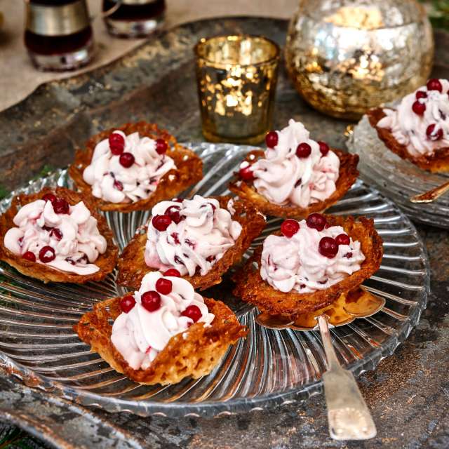 Lägg kakorna över små glas eller runda mandelmusselformar så fort du kan flytta dem från plåten med t ex en stekspade.