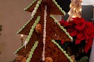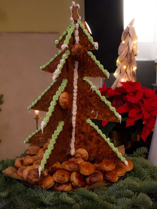 Sätt sedan vinklarna mitt emot varandra och limma återigen med karamell. Avsluta med att sätta granen fast på foten.