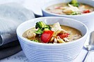 Tillsätt sedan broccoli och tomat och låt puttra i ytterligare 5 min tills kycklingen är klar. Smaka av med limeskal- och saft innan servering.