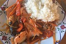 Strimla ingefära röd paprika och morot .stek fisk varsamt ,stek övriga råvaror kort krydda med soya vinäger .