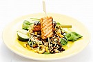 5. Plocka fina blad av pak soisalladen och fördela på fyra tallrikar. Lägg nudelblandningen på och laxspetten överst. Slå över såsen.
