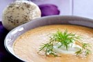 1. Skala och skär morötterna i bitar och koka dem mjuka i vattnet. Ta upp morötterna och spara spadet. Mixa morötterna till puré. Skala och hacka löken och fräs utan att den får färg. 2. Dofta över mjöl och späd med buljong och morotspuré. Låt soppan sjuda en stund men inte koka. Rör till sist ner konjak och grädde och smaka av med peppar. Servera med crème fraiche och dill. Receptet kommer från boken Tjejmiddag av Malou Holm och Åsa Swanberg, Ordalaget Bokförlag