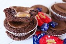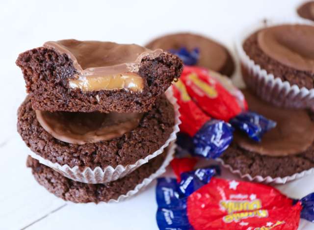 Blanda sist i smöret och rör tills smeten är ordentligt blandad. Häll upp i formarna 2/3 – med smet. Trycks ner en varsin dumle i mufffinsen, och grädda sedan i mitten på ugnen i cirka 8-10 minuter. Ta ut och lägg en noblesschoklad på varje.