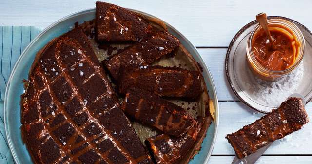 Häll smeten i formen. Ringla över dulce de leche och strö på flingsalt.