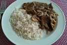 1. Starta med att koka riset. 2. Stek champinjonerna i het panna eller wok på högsta värme utan olja. Lägg sen åt sidan i en skål. 3. Stek köttet i lite olja på högsta värme. Lägg i vitlöken och häll i sojan och rör om. 4. Häll på vattnet, sherryn, ostronsåsen och häll i buljongen. När det kokat upp så lägg ner champinjonerna och bambuskotten. Koka i 1-2 minuter och red sedan såsen med maizenan till önskad konsistens. Häll till sist över sesamoljan.
