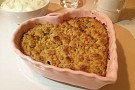 4. Lägg äppelbitarna i en smord pajform. Pudra över kanel.