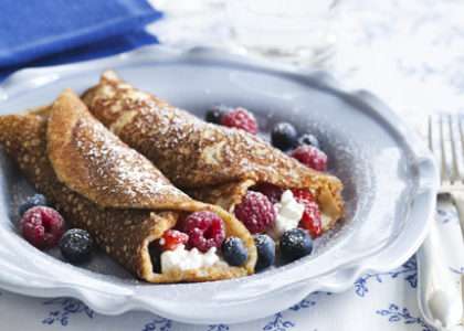 Vispa mjölet med hälften av mjölken till en klimpfri smet. Vispa ner ägget, resten av mjölken och 1 msk flytande smör/olja. Stek 8 pannkakor i resten av fettet. Blanda keso med vaniljsocker. Fördela i de stekta pannkakorna tillsammans med bär. Rulla eller vik ihop och pudra över florsocker.