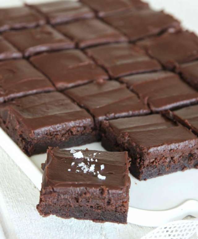 5. Bred ut tryffeln på kakan när den tjocknat och blivit bredbar. Skär kakan i rutor, ca 5 x 4 st. Strö eventuellt lite flingsalt på några av rutorna när de svalnat.