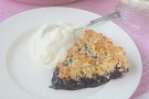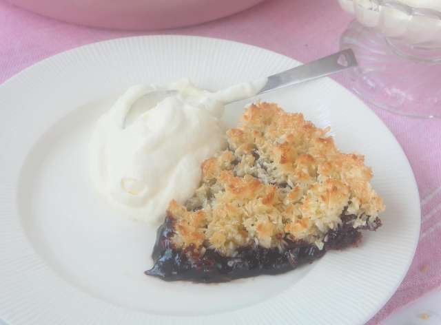 5. Bred ut kokostoscan ovanpå kladdkakan i formen väldigt försiktigt så kladdkakan inte blir kletig.