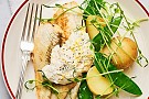 Servera spättan med potatis, sockerärtor, sås, citronklyftor och ärtskott.