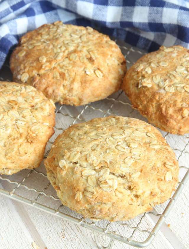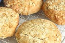 1. Sätt ugnen på 250 grader. Blanda vetemjöl, havregryn, salt och bakpulver i en bunke. Tillsätt smöret och nyp ihop det med de torra ingredienserna. Tillsätt mjölken och blanda ihop allt till en kladdig deg.