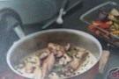 Tillsätt creme fraiche, vatten, buljong,låt koka ip svag värme ca 5min. Mot slutet, lägg i timjan.