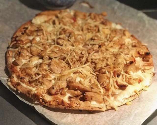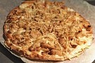 Bred ett tunt lager av såsen på libabrödet och toppa med kyckling. Hacka jordnötter grovt och strö över, tillsammans med ost.