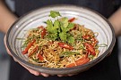 1. Koka först nudlarna cirka 2-3 minuter, de får inte bli klara. Häll av vattnet och spola dom i kallt vatten. Ställ åt sidan.