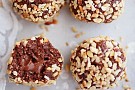 Låt smeten stå i kylskåpet i ca 30 minuter delar den i 12 lika stora delar. Platta till varje del i handen och lägg en fryst Nutellaklick i mitten av den. Vik över kanterna och rulla till en jämn boll och rulla sedan bollen i hasselnötskrosset.