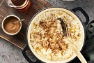 Låt mjölken koka upp i en annan kastrull och tillsätt den i riskastrullen. Sätt in riskastrullen i ugnen med lock ca 45 minuter.