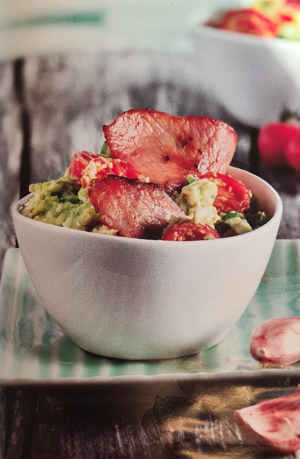 ■Hårdkoka äggen. Låt dem svalna i kallt vatten, skala dem och ställ dem kallt i kylskåp. Stek under tiden baconskivorna knapriga i en teflonpanna och bryt dem i små bitar. Skala avokadorna och ta bort kärnorna.
