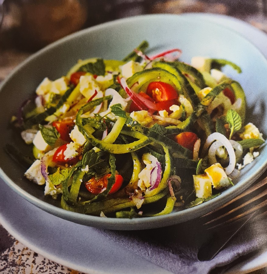 ■Lägg gurknudlarna på tallrikar, fördela fårost och tomater ovanpå och lägg över rädisespaghetti och lökstrimlor. Strö över myntan, droppa över dressing och servera.